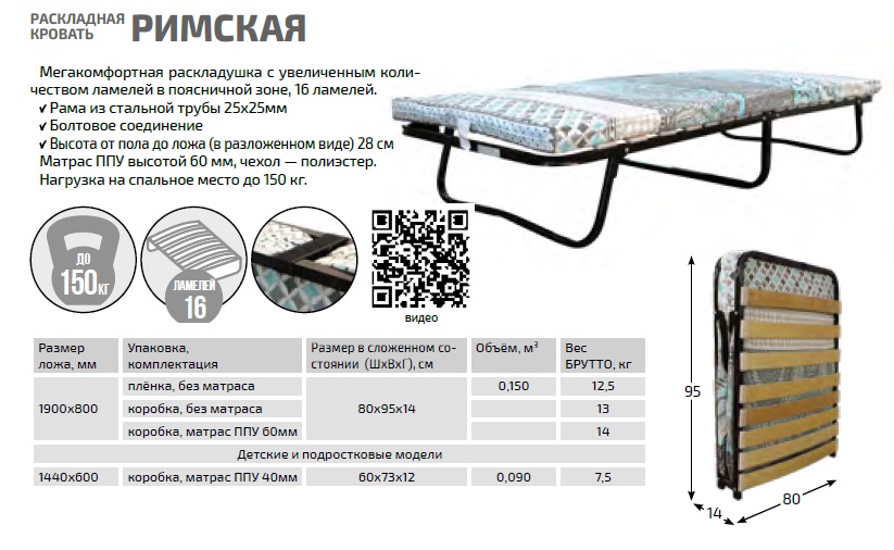 Выполнена из гнутой квадратной трубы 25х25, размеры 1900х800мм. На раскладушке 16 ламелей с прочным и долговечным креплением. Выдерживает нагрузку до 150 кг. Матрас из ППУ высотой 70 мм. входит в комплект.